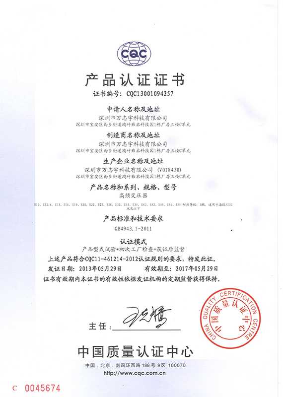 萬志宇CQC產(chǎn)品認(rèn)證證書